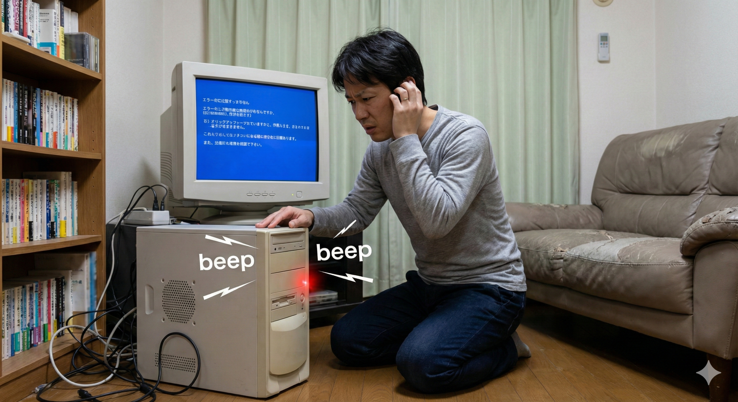 「画面に『故障です』って書いてくれればいいのに」と思うかもしれませんね。でも、ビープ音が鳴るときというのは、**「画面を映すための部品すら動かせないほど、パソコンが困っている状態」**なのです。