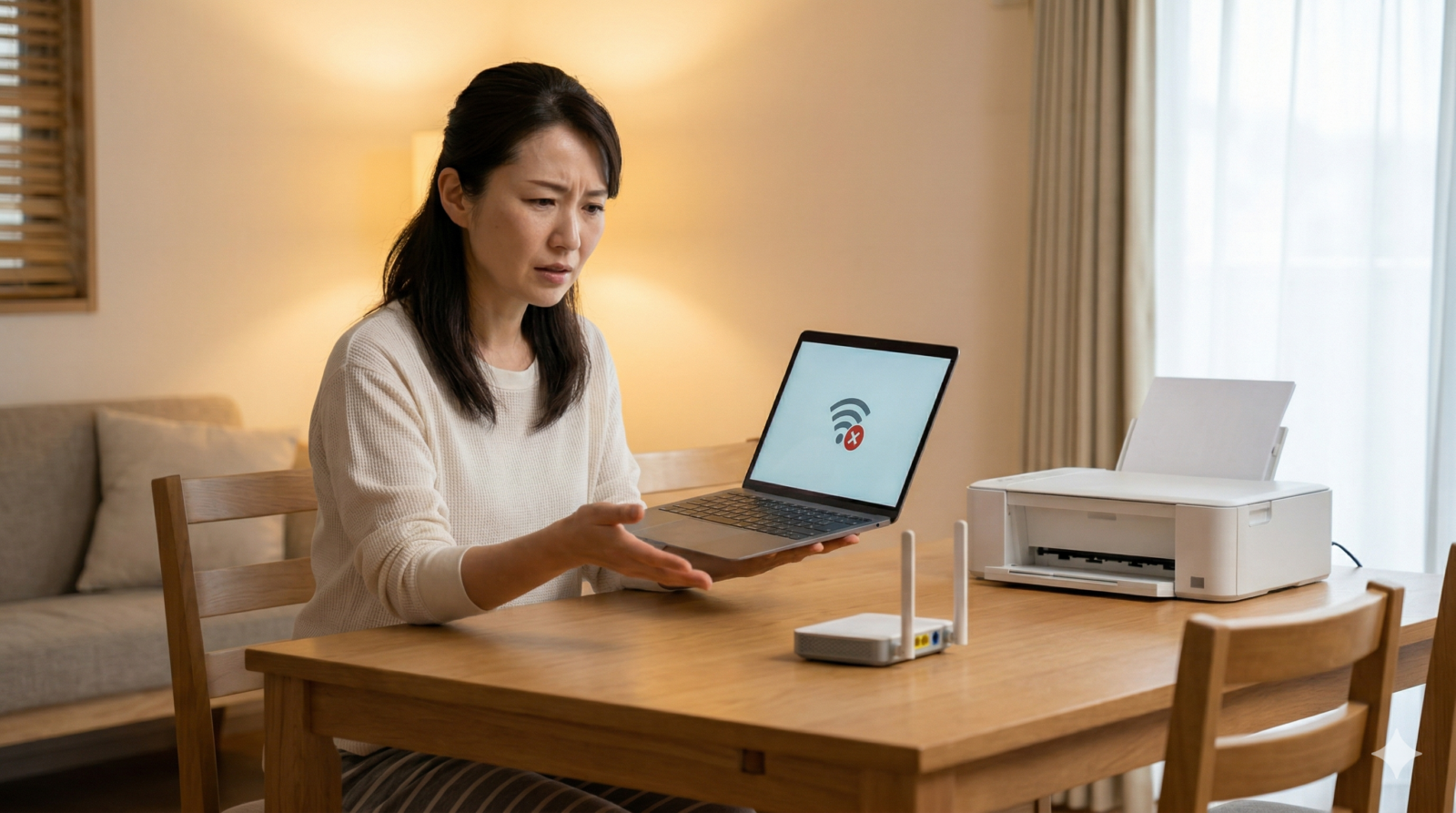 A. 「プリンターが寝ている」か「声が届かないところにいる」状態です。電源が入っているか確認し、Wi-Fiのランプが点滅ではなく点灯しているか見てみましょう。一度USBケーブルを抜き差しするだけで「あ、起きた!」と復活することもあります。