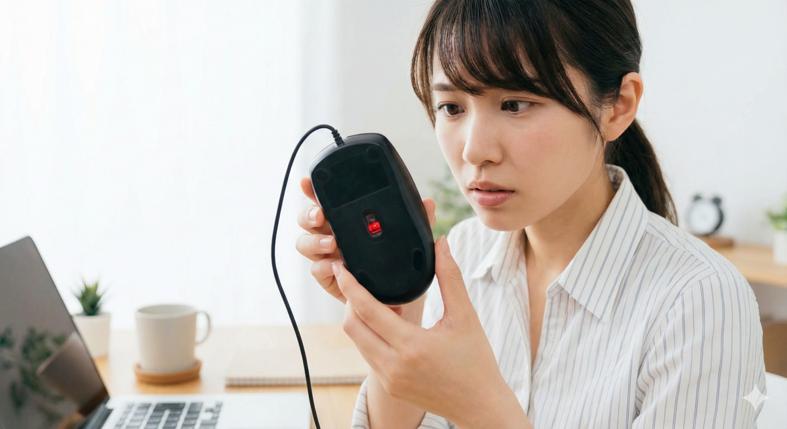 マウスの裏側のレンズにホコリや髪の毛が挟まっていないか確認しましょう。